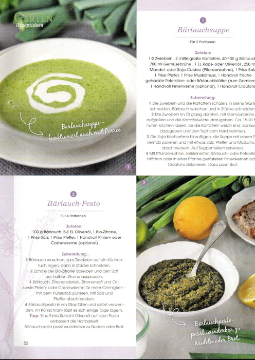 - Vom Garten auf den Tisch – Schon der Frühlingsgarten bietet viele Möglichkeiten, rein pflanzliche Gerichte zu kreieren – der Fantasie sind keine Grenzen gesetzt, mit vier Rezepten: Bärlauch-Suppe, Bärlauch-Pesto, Spargel-Risotto, Bunter Feldsalat; Text, Rezepte und Food-Fotos: Beate Förster; Magazin Mein LandGarten Nr. 2 2025, Seite 51 – 53;
